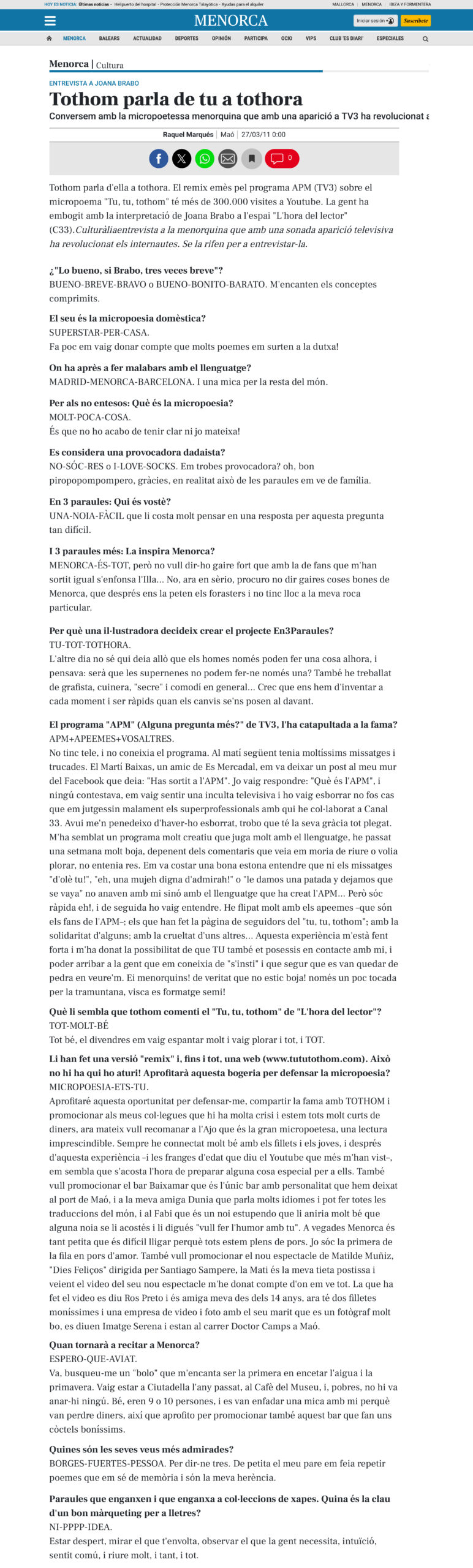 Este proyecto ha recibido el respaldo de la convocatoria Art for Change de la Fundació “la Caixa”, del Departamento de Cultura del Consell Insular de Menorca y del Institut d’Estudis Baleàrics. En paralelo, Brabo se encuentra desarrollando un documental y una exposición vinculados al proyecto, con previsión de presentación en 2026.