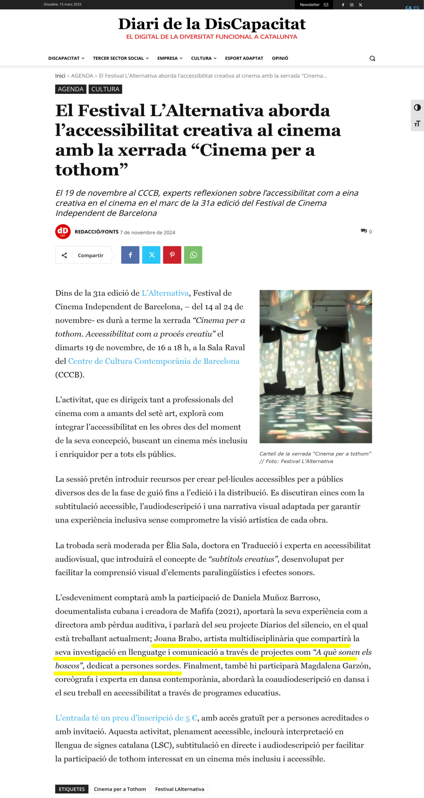 Desde 2023, la artista combina su trabajo unipersonal con el proyecto de Mediación Artística con Personas Sordas en Lengua de Signos A QUÉ SUENAN LOS BOSQUES, un espacio de exploración en torno a la accesibilidad y los límites de la comunicación.