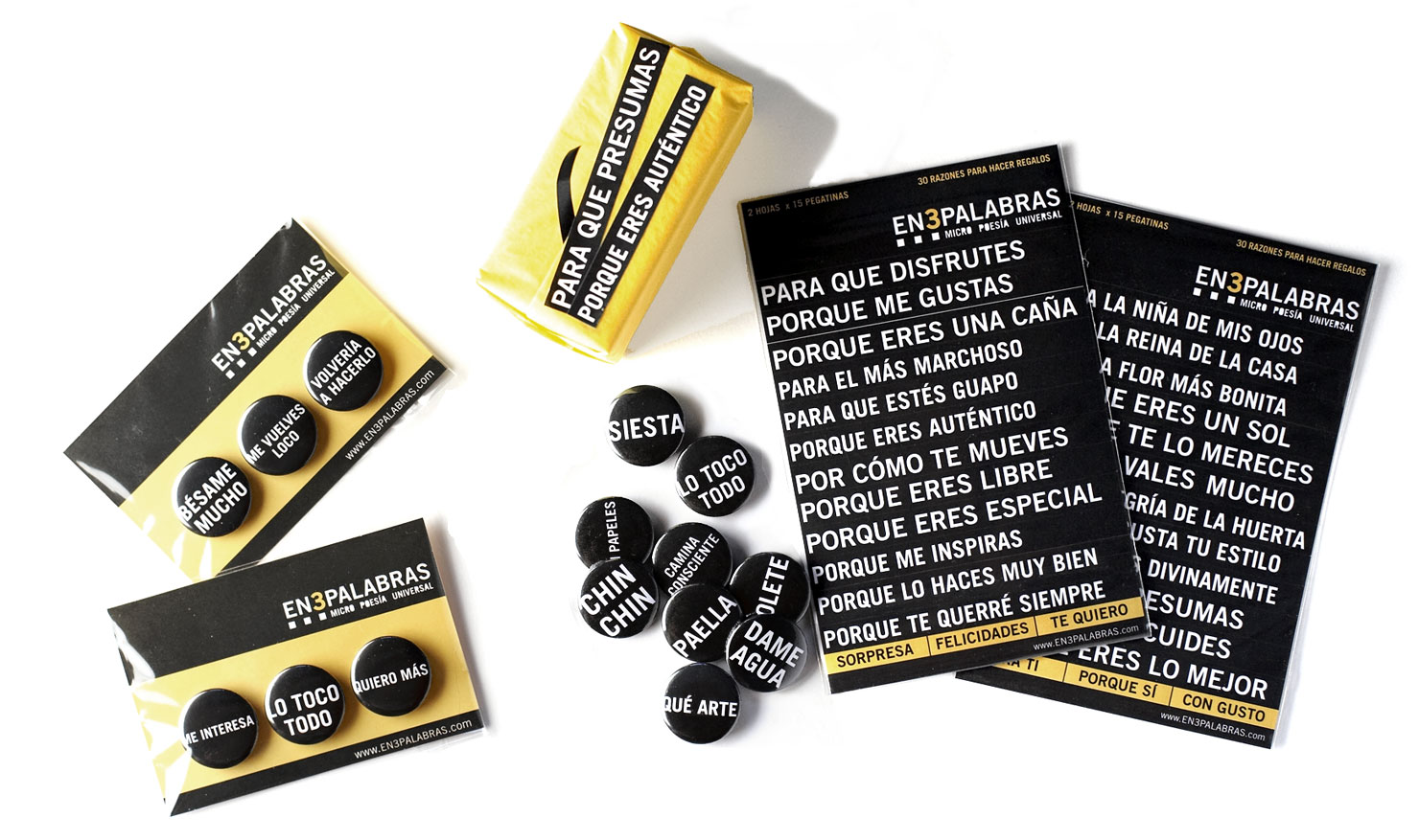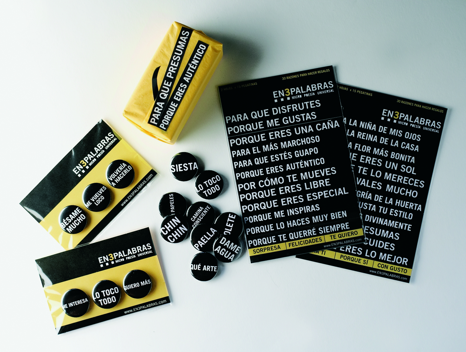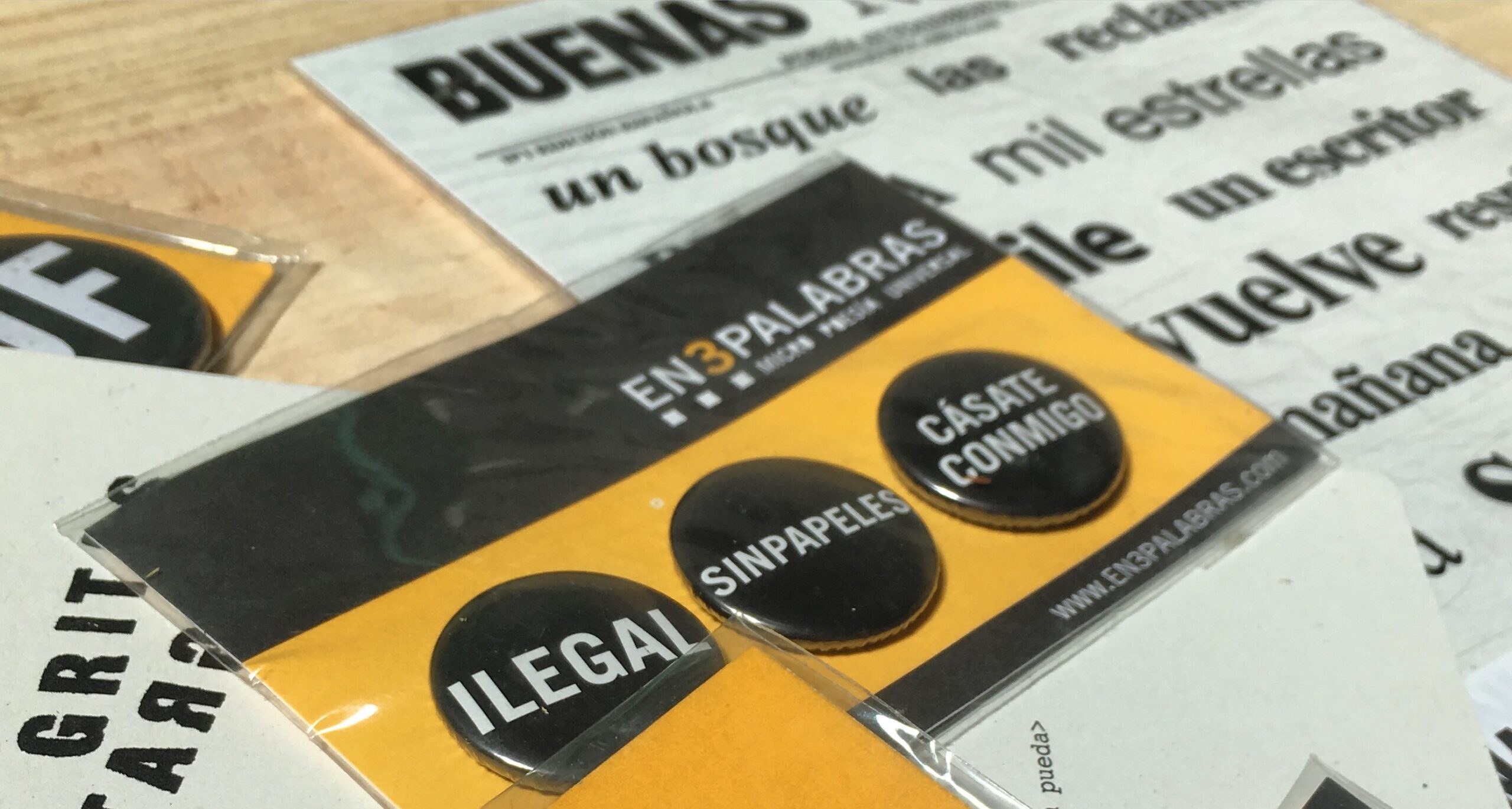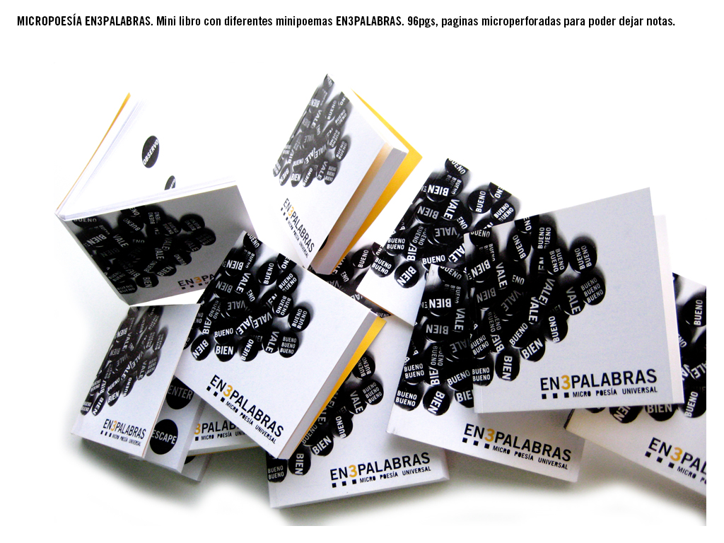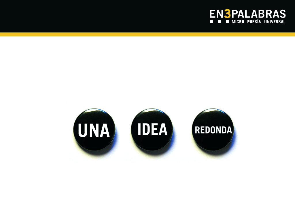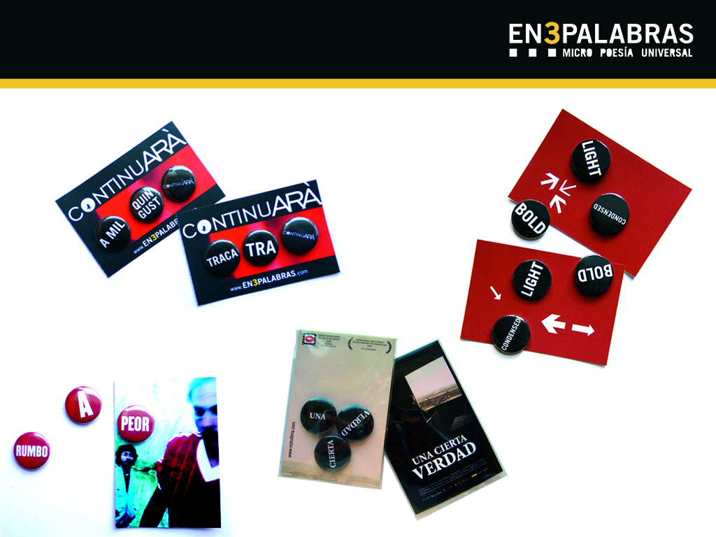 Así nació la micropoesía EN3PALABRAS. Se materializó en forma de chapas y la magia de las palabras se instalaba en la solapa para transmitir conceptos, sensaciones, estados de ánimo, voluntades, en fin, todo aquello que yace en el subconsciente pero uno no es capaz de verbalizar. Ahí estaba. En tres chapas.