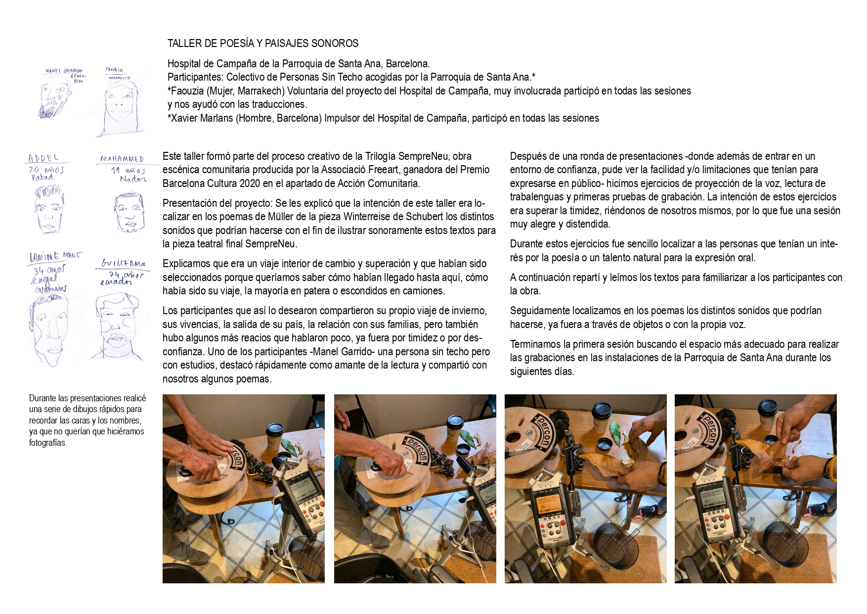 Taller de paisajes sonoros y poesía con el colectivo de personas sin techo acogidas por el Hospital de Campaña de la Iglesia de Santa Anna en Barcelona.
