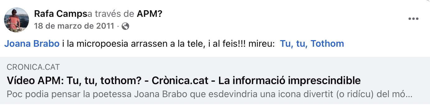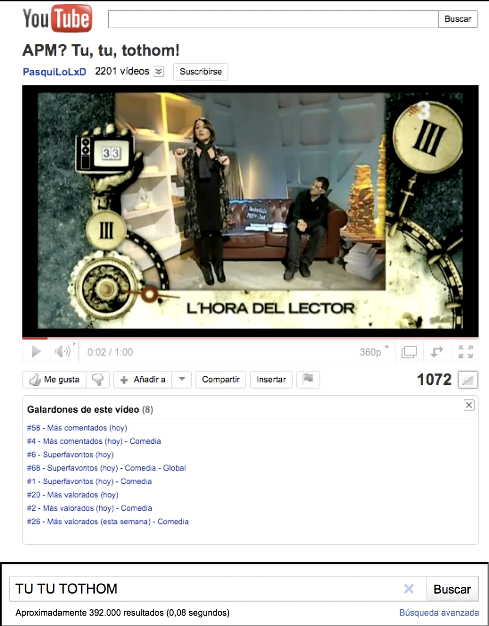 La semana siguiente, APM? (Alguna Pregunta Més? Algun Poema Més?) lo cazó, lo reeditó y lo lanzó al hiperespacio televisivo. El resultado: un fenómeno viral sin precedentes en la poesía catalana.